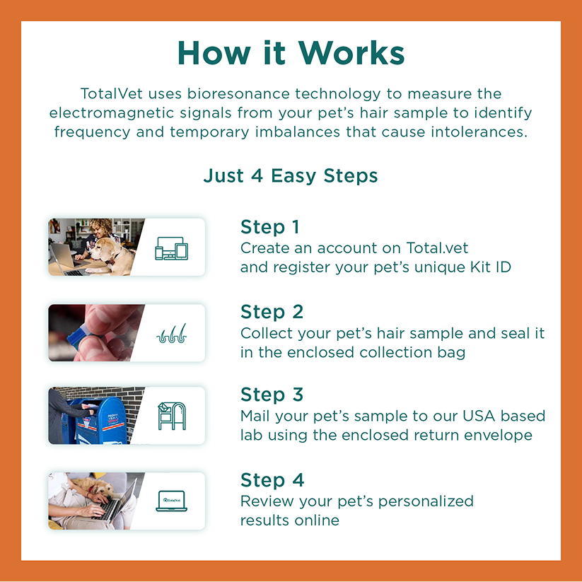 The TotalVet Dog Allergy Test is a non-invasive, at-home hair test that screens for over 1,000 potential intolerances and sensitivities. Results are presented in an easy-to-read digital report that highlights subtances that may be contributing to your pet's symptoms.